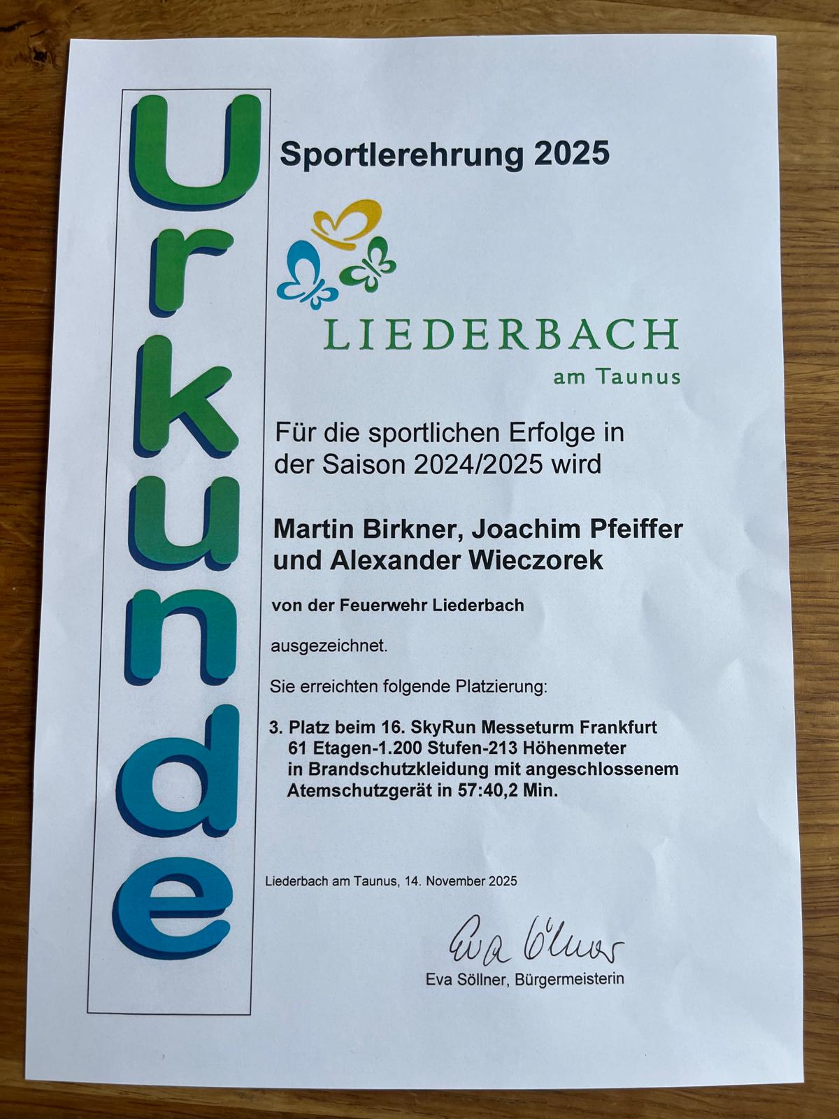 Im Rahmen der diesjährigen Sportlerehrung der Gemeinde Liederbach wurden am vergangenen Freitag die Sportler Martin Birkner, Joachim Pfeiffer und Alexander Wieczorek für ihre herausragende Leistung beim 16. SkyRun Frankfurt geehrt.